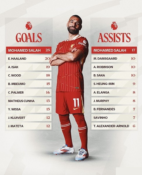 萨拉赫领跑英超射手榜和助攻榜,斯洛特不仅将带来联赛冠军,还有可能为利物浦带来一位金球奖得主。
